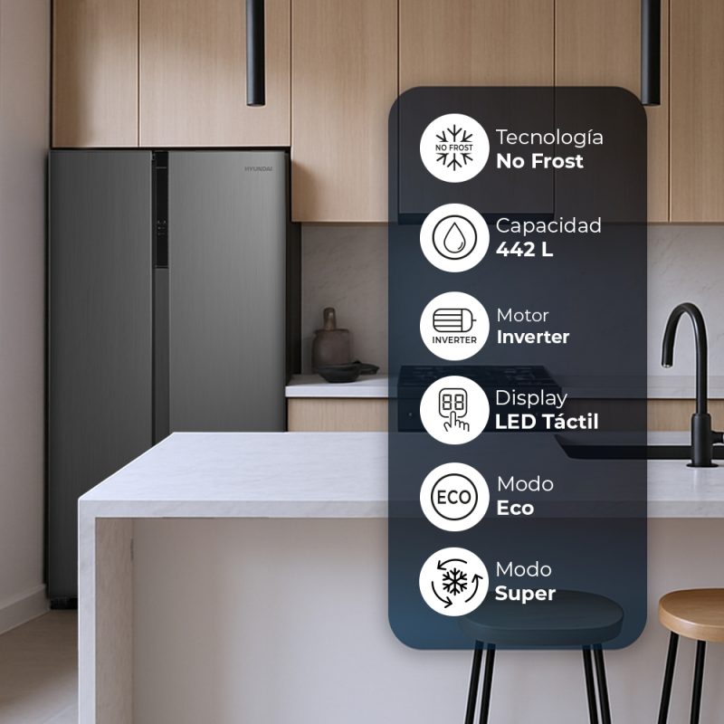 Capacidad total de 442 Litros, con congelador 4 estrellas y múltiples compartimentos para un óptimo almacenaje.