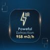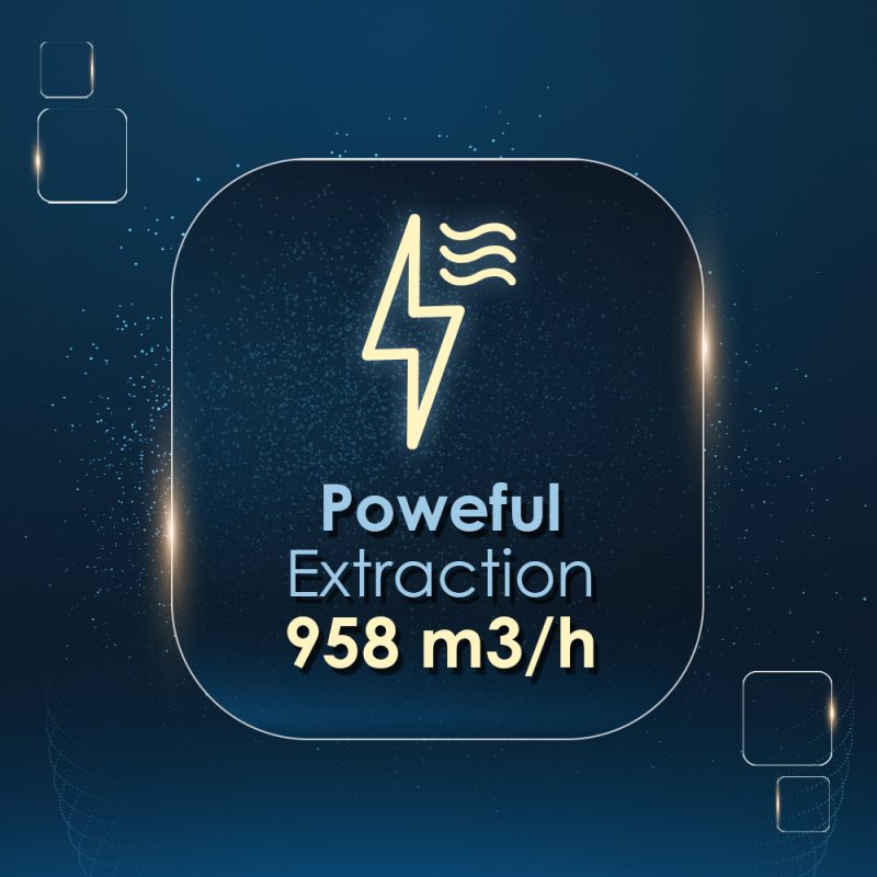 Campana de doble tiro con motor Inverter y potencia de aspiración de 958 m3/h. Eficiencia energética A++ y nivel sonoro de 68 dB.