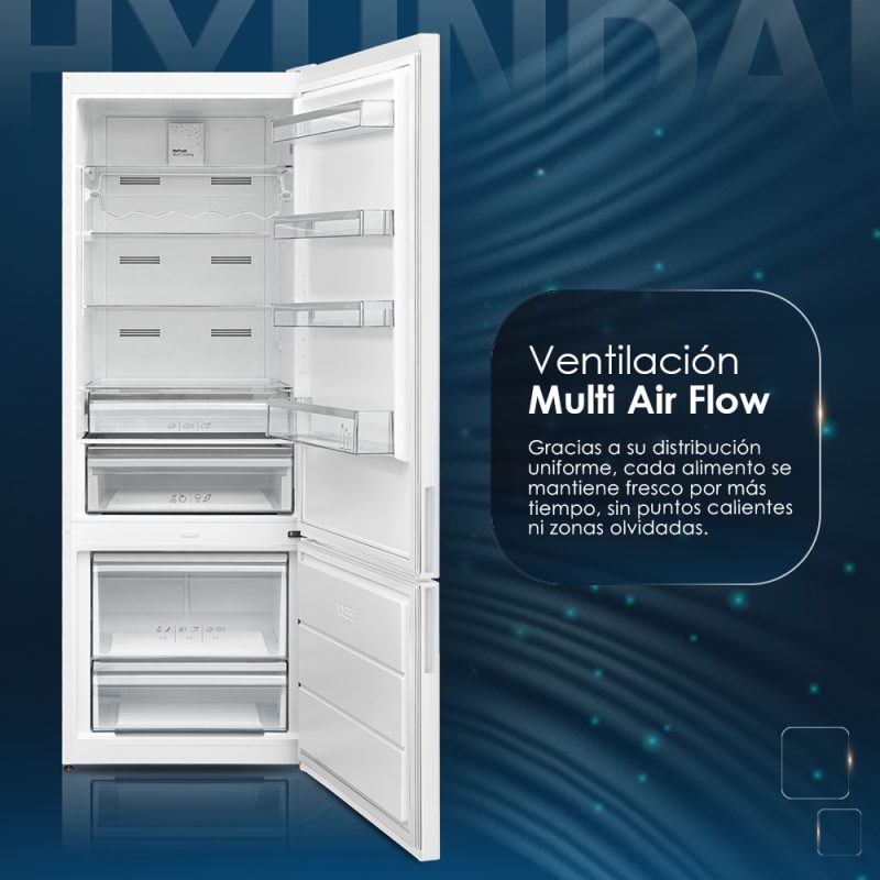 – La tecnología No Frost garantiza una óptima conservación de los alimentos y evita la formación de hielo y escarcha en el frigorífico. Junto con la ventilación Multi Air Flow, consiguen una distribución uniforme en toda la cavidad y un enfriamiento más rápido.