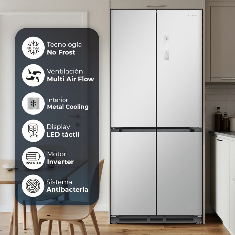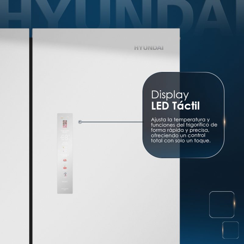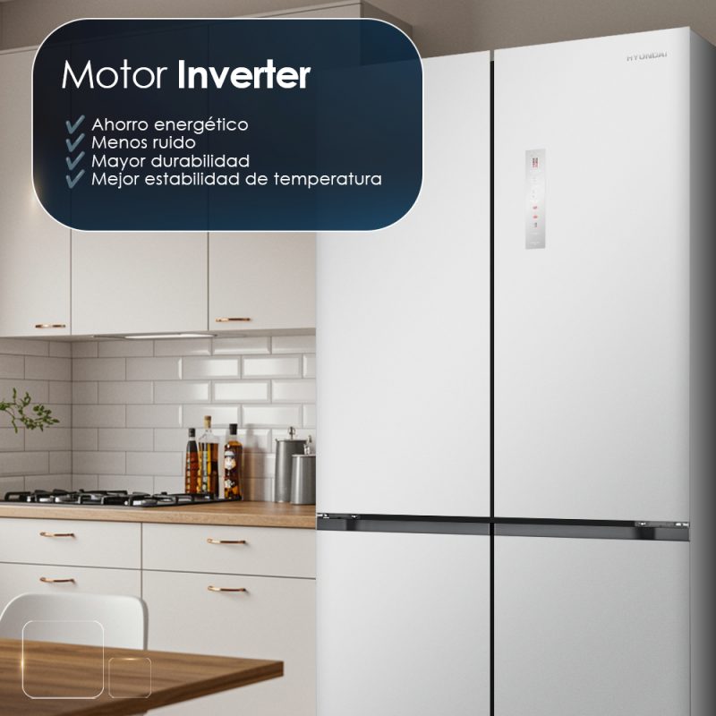 Frigorífico 4 Puertas de semi integración Hyundai, No Frost. Clase E. Dimensiones: 193cm 83,3cm 59,8cm. Color Inox, Control con Display táctil. Motor Inverter.