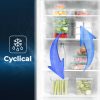 Frigorífico de tecnología cíclica, con motor universal y gas R600a. Eficiencia energética E y nivel sonoro máximo de 41 dB.