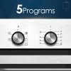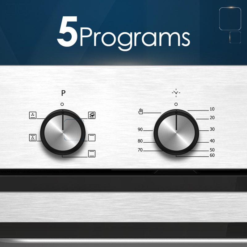 Estética Inox con puerta de doble cristal. Dispone de soporte metálico para las bandejas e iluminación interior. Panel de control manual y mandos estándar, con termostato mecánico y temporizador mecánico. Ofrece 5 programas de cocción y diversas funciones para obtener el mayor rendimiento y facilitar el proceso de cocción.