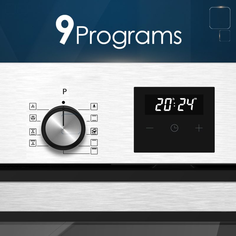 Estética Inox con puerta de doble cristal. Dispone de guías telescópicas, soporte metálico para las bandejas e iluminación interior. Panel de control electrónico con Display LED y mandos estándar, con termostato mecánico y temporizador digital. Ofrece 9 programas de cocción y diversas funciones para obtener el mayor rendimiento y facilitar el proceso de cocción.