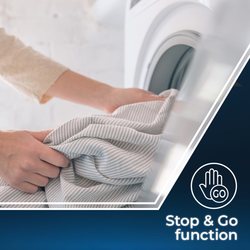 – Gracias a la función Stop&Go podrás añadir esa prenda olvidada. Simplemente, pausa el programa y , tras seleccionar de nuevo la función, este se reanudará justo donde se quedó.