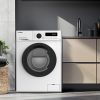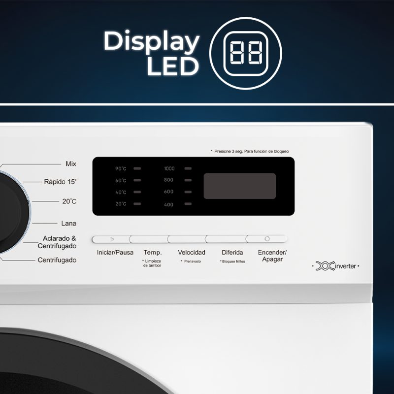 Estética blanca con puerta XXL transparente, tambor de acero inoxidable. Sistema de control electrónico con Display LED con 12 programas de lavado y funciones para garantizar el mejor resultado y cuidado en tu colada.