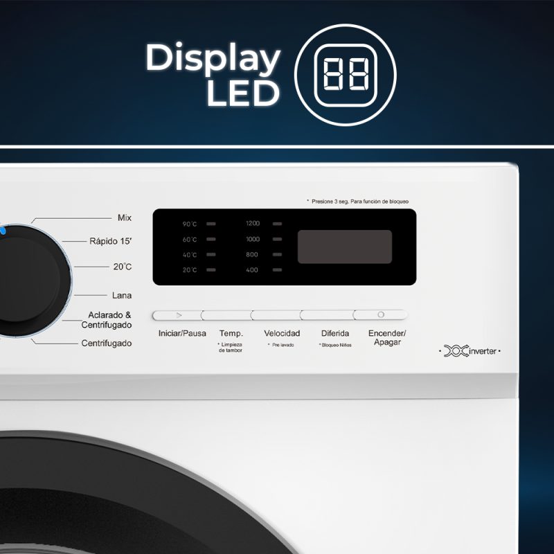 Estética blanca con puerta transparente, tambor de acero inoxidable. Sistema de control electrónico con Display LED con 12 programas de lavado y funciones para garantizar el mejor resultado y cuidado en tu colada.