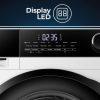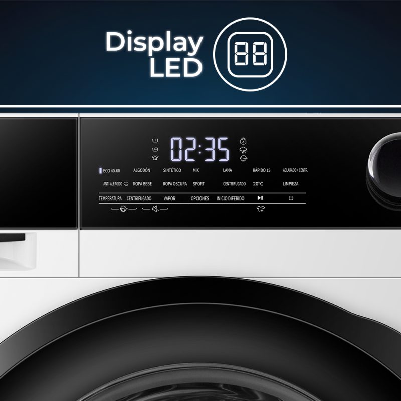 Estética blanca con puerta XXL transparente, tambor de acero inoxidable con superficie Waterdrop y chasis Boomerang antivibraciones. Sistema de control táctil con Display LED con 14 programas de lavado y funciones para garantizar el mejor resultado y cuidado en tu colada.