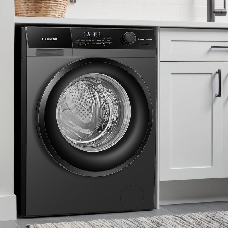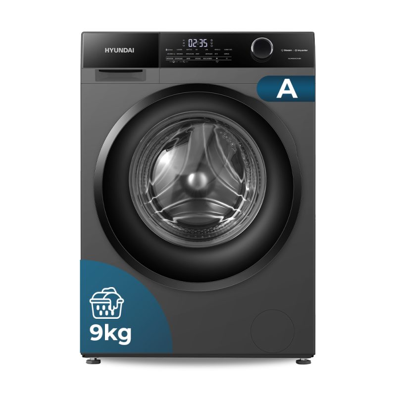 Lavadora Hyundai 9kg 1400rpm A 84,5cm 59,5cm 58cm Inox Display táctil Inverter Vapor Antialérgico Mi Ciclo Puerta XXL T.Waterdrop C.Boomerang
