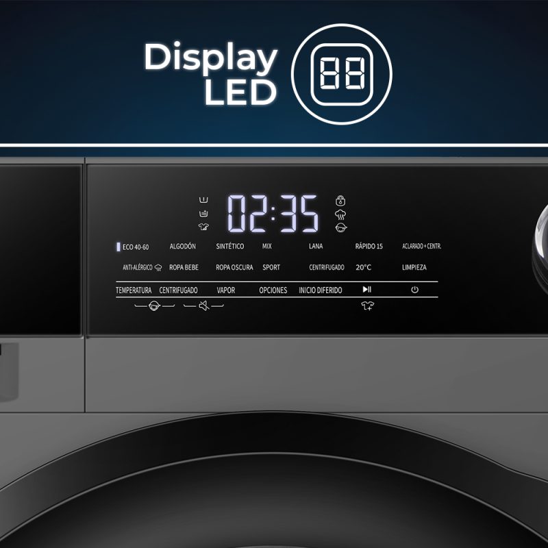 Estética inox con puerta XXL transparente, tambor de acero inoxidable con superficie Waterdrop y chasis Boomerang antivibraciones. Sistema de control táctil con Display LED con 14 programas de lavado y funciones para garantizar el mejor resultado y cuidado en tu colada.