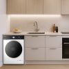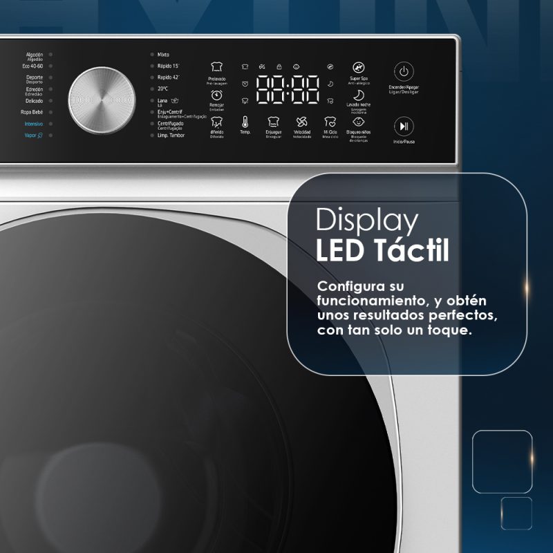 Estética blanca con puerta XXL oscuro, tambor de acero inoxidable. Sistema de control táctil con Display LED con 16 programas de lavado y funciones para garantizar el mejor resultado y cuidado en tu colada.