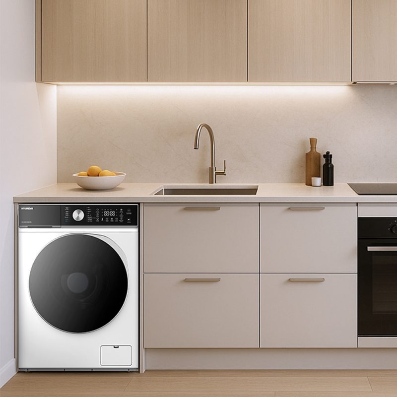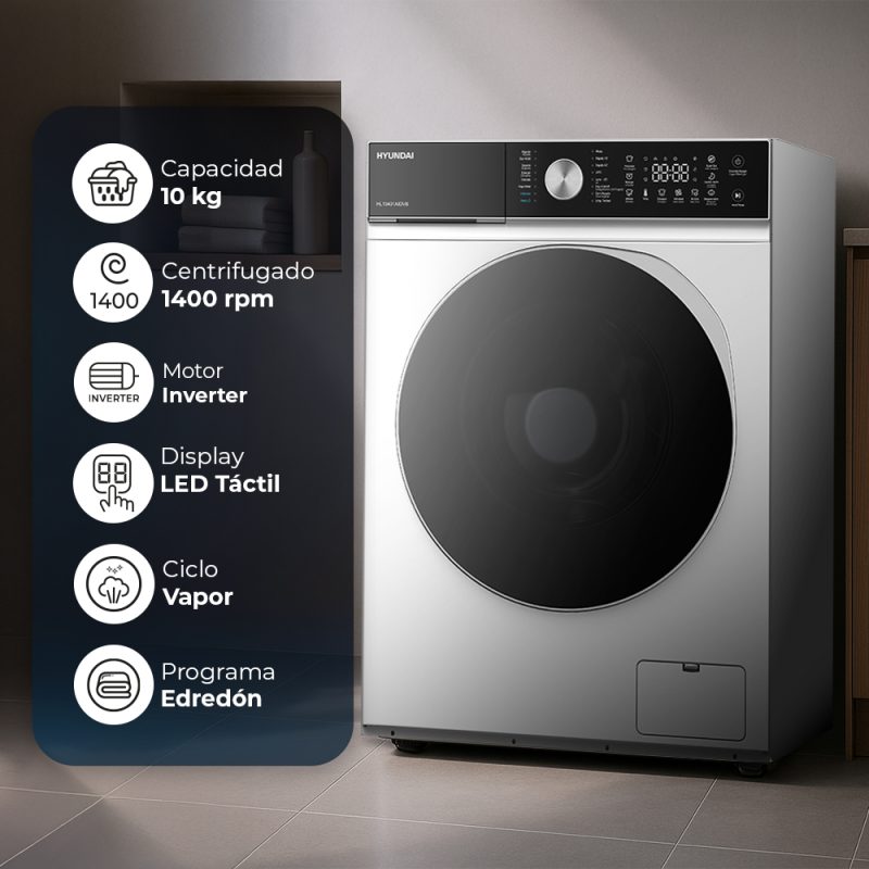 Lavadora Hyundai,Capacidad 10kg 1400rpm, Clase A. Dimensiones: 85cm 59,5cm 60cm. Color Blanco, Control con Display táctil. Motor Inverter. Vapor