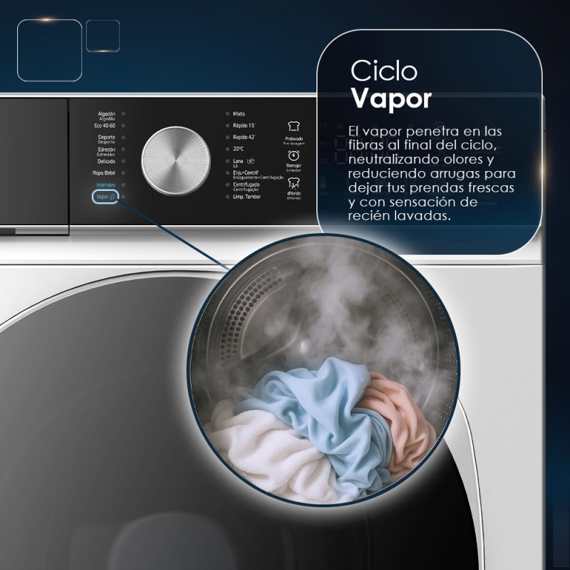 – Añade la fase de Vapor al programa para neutralizar los olores y evitar la aparición de arrugas en las prendas.