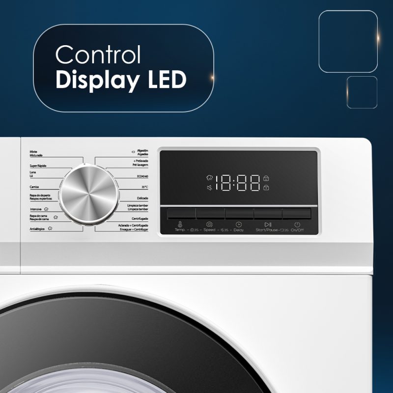 Estética blanca con puerta XXL oscuro, tambor de acero inoxidable. Sistema de control electrónico con Display LED con 16 programas de lavado y funciones para garantizar el mejor resultado y cuidado en tu colada.