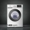 Lavadora con capacidad de carga 12 kg y una velocidad máxima de centrifugado de 1400 rpm. Motor Inverter con eficiencia energética A y nivel sonoro máximo de 76 dB.