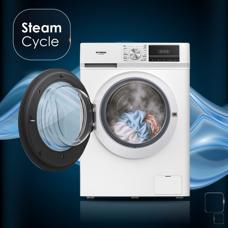 Lavadora Hyundai,Capacidad 12kg 1400rpm, Clase A. Dimensiones: 85cm 59,5cm 65cm. Color Blanco, Control con Display. Motor Inverter. Programas: Vapor Antialérgico.