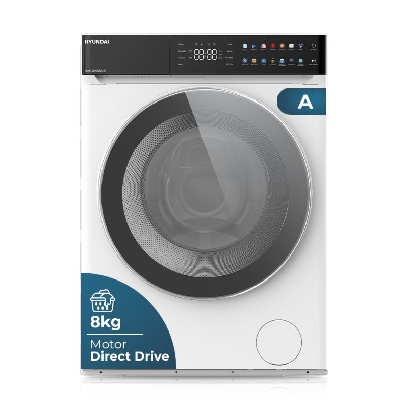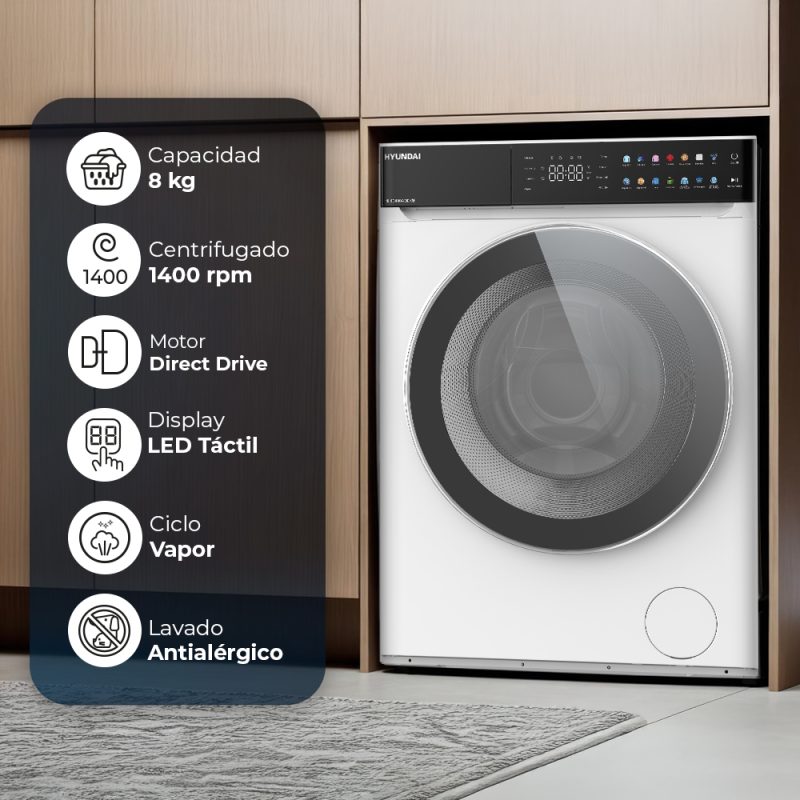 Lavadora Hyundai,Capacidad 8kg 1400rpm, Clase A. Dimensiones: 85cm 60cm 60cm. Color Blanco, Control con Display táctil. Motor Direct Drive. Programas: Vapor Antialérgico.