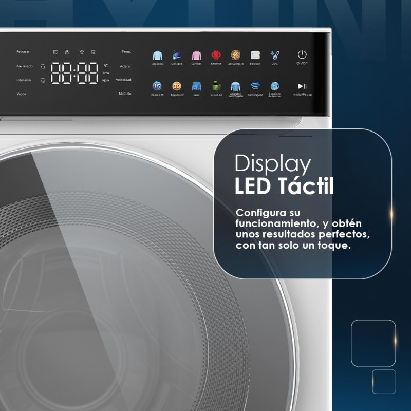 Estética blanca con puerta XXL oscuro, tambor de acero inoxidable. Sistema de control táctil con Display LED con 14 programas de lavado y funciones para garantizar el mejor resultado y cuidado en tu colada.
