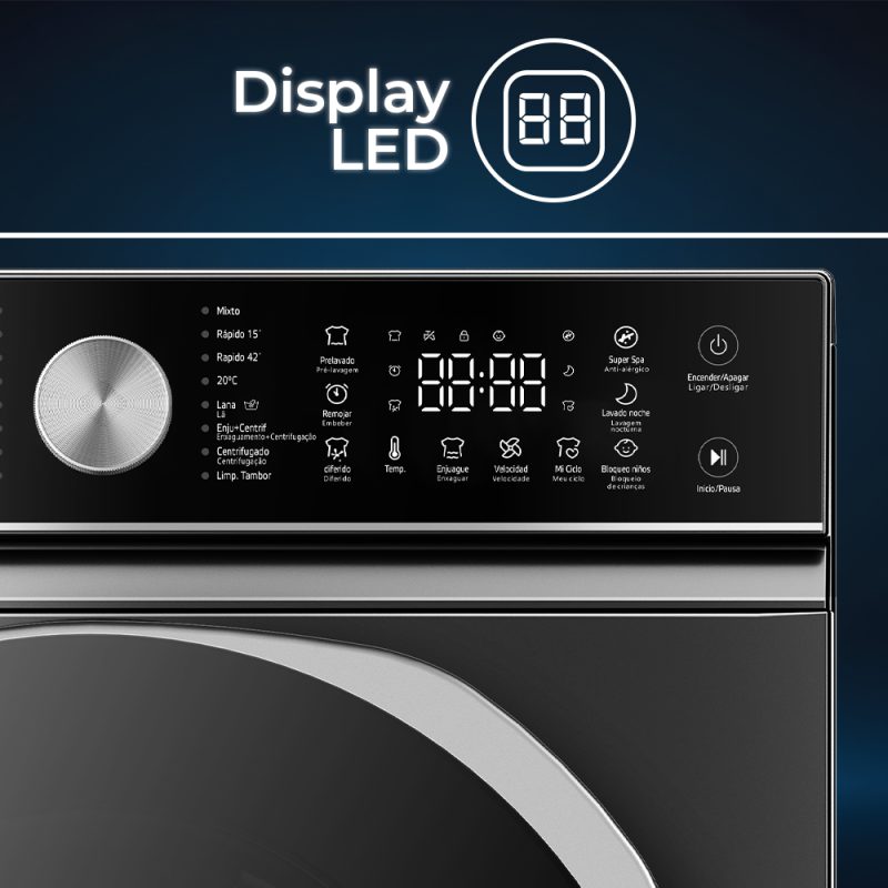 Estética inox con puerta XXL oscuro, tambor de acero inoxidable. Sistema de control táctil con Display LED con 16 programas de lavado y funciones para garantizar el mejor resultado y cuidado en tu colada.