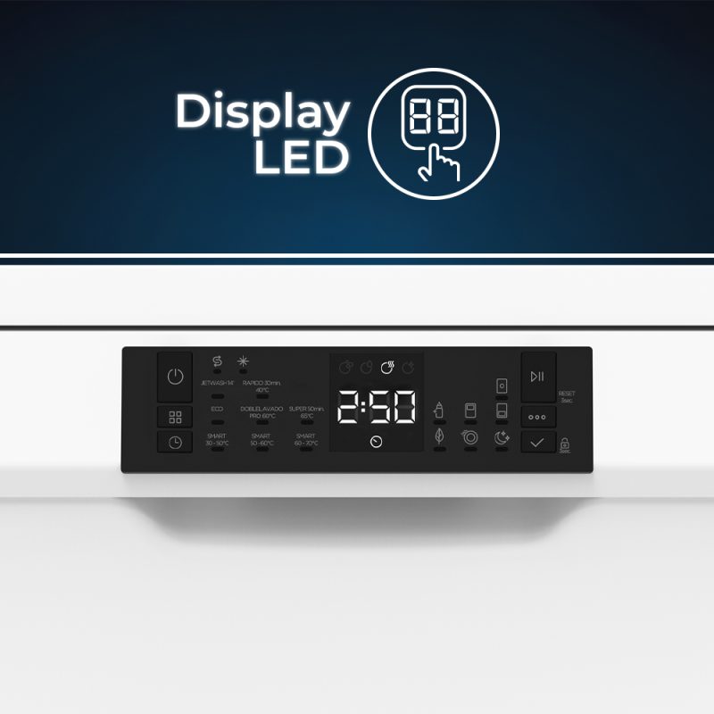 Estética blanca con 3 bandejas y cesta de cubiertos. Sistema de control electrónico con Display LED con 8 programas de lavado y funciones para garantizar el mejor resultado y cuidado de la vajilla.