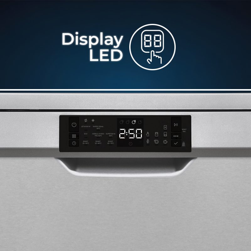 Estética inox con 3 bandejas y cesta de cubiertos. Sistema de control electrónico con Display LED con 8 programas de lavado y funciones para garantizar el mejor resultado y cuidado de la vajilla.