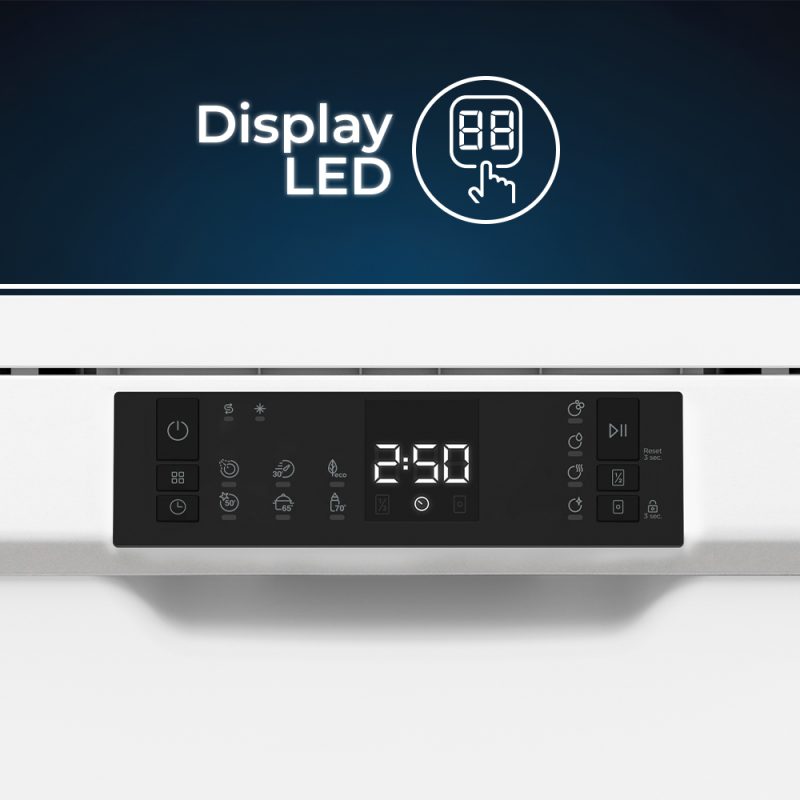 Estética blanca con 2 bandejas y cesta de cubiertos. Sistema de control electrónico con Display LED con 6 programas de lavado y funciones para garantizar el mejor resultado y cuidado de la vajilla.