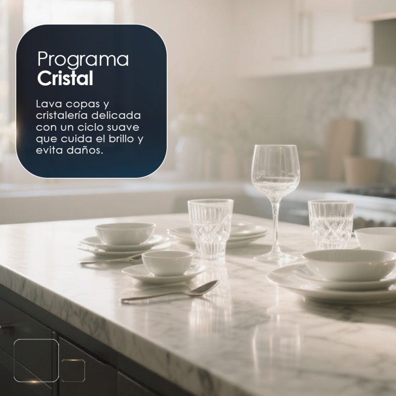 – El programa Cristal actúa a baja temperatura para evitar dañar la superficie y mantener el brillo de la cristalería.
