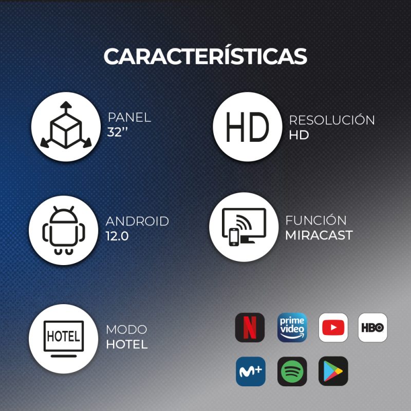 Panel LED de 32 in, máxima calidad de imagen HD y eficiencia energética E. Televisión Android versión 12.0 y es compatible con sintonizador DVB-S2/T2.